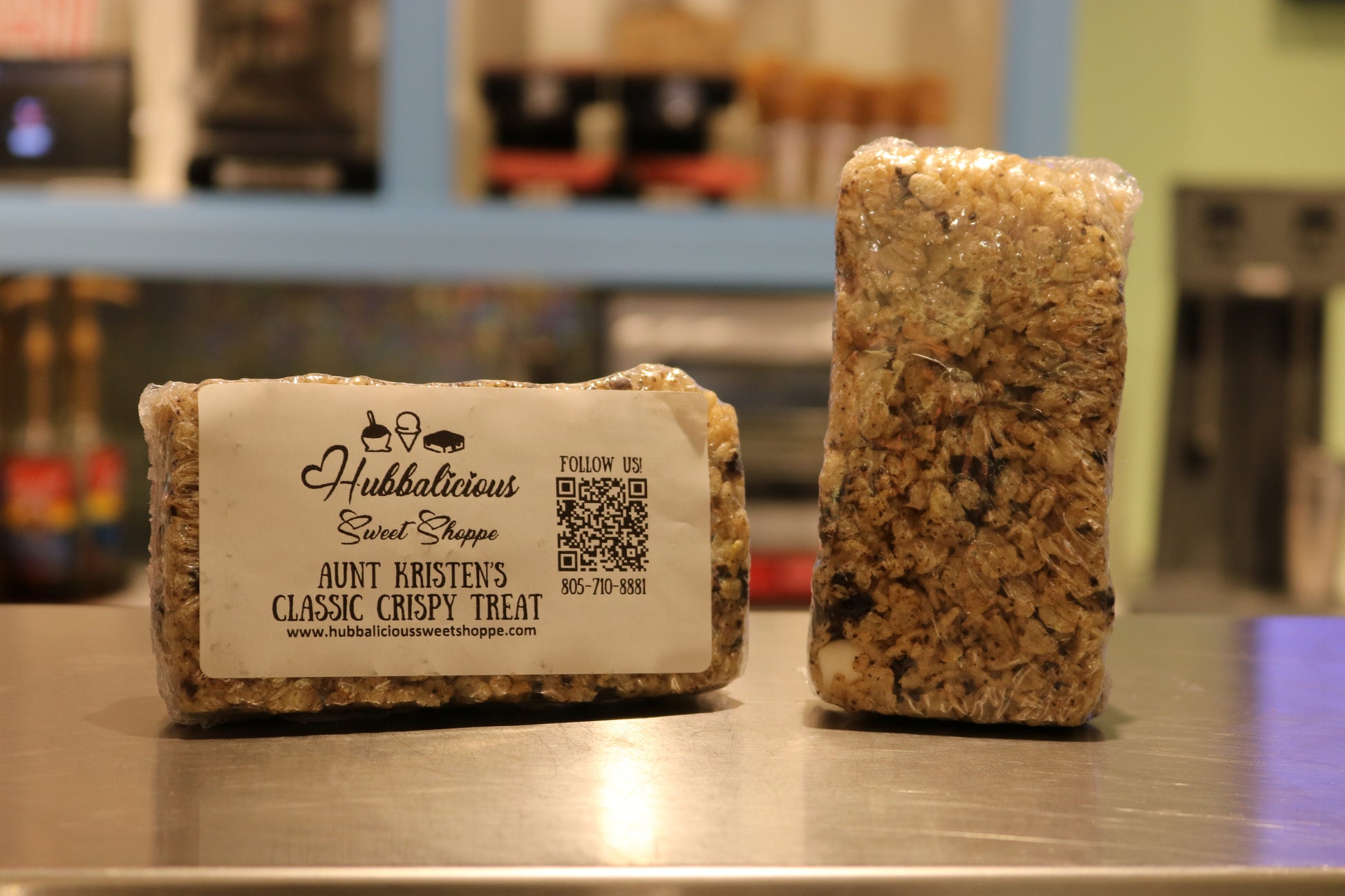 Hubbalicious Aunt Kristen's Oreo Classic Crispy Treat 6 OZ – A chewy, crunchy rice krispy treat made with Oreo cookie pieces. Individually wrapped for freshness, Net Wt 6 OZ (170 g).